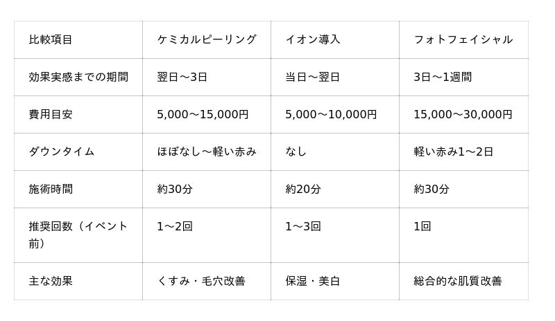【エビデンス】日本皮膚科学会のガイドラインでは、ケミカルピーリングはニキビや軽度の色素沈着に対して有効性が認められています。また、皮膚科医としての臨床経験では、イベント前の集中ケアとして複数の施術を組み合わせることで、相乗効果が得られるケースが多く見られます。