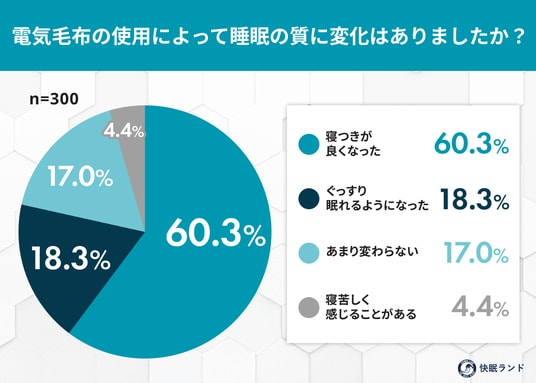 寒さが厳しくなる冬、手軽な防寒アイテムとして注目される「電気毛布」。一方で、「乾燥しそう」「寝苦しくならない?」といった不安から、導入を迷う声も少なくありません。快眠グッズ紹介サイト「快眠ランド」を運営するムーンムーン株式会社は、就寝時に電気毛布を利用したことがある人300名を対象に、使用実態や感じたメリット・デメリット、睡眠への影響について調査を実施しました。結果からは、多くの人が暖かさや寝つきの改善を実感する一方で、暑さや乾燥といった悩みも一定数存在することが明らかになりました。