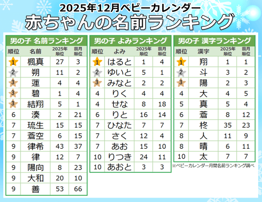 2025年12月生まれ 男の子に人気の名前ランキング|ベビーカレンダー月間名前ランキング調べ