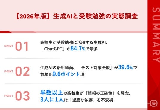 まず、受験勉強に活用する生成AIは「ChatGPT」が84.7%で最多、「Gemini」が25.2%で続きました。活用場面では「テスト対策全般」が39.6%で2025年比9.6ポイント増加し首位に浮上、「授業の復習」35.1%が続いています。生成AIが役立っている科目は「数学」が36.0%で最多となり、2025年比14.0ポイント増加しました。具体的な活用場面では「問題の解き方を質問する」が55.7%で2年連続1位、2025年比10.0ポイント増加しています。一方、生成AI活用における不安として「情報の正確性」を挙げた高校生は52.3%で2025年比13.3ポイント増加、「過度に依存してしまう」も33.3%となりました。生成AI活用のメリットでは「短時間で必要な情報を得られる」が60.4%で2年連続最多。実際に感じた悪影響として「すぐにAIに頼るようになった」が58.6%で最多となりました。生成AIに頼りすぎない工夫をしている高校生は40.5%で、具体的な工夫として「まず自分で考えてから使う」が66.7%で最多となっています。受験本番を見据えた今後の活用意向では、84.7%が「生成AIを活用する」と回答し、「必要な場面で適度に活用していきたい」が64.9%で最多となりました。