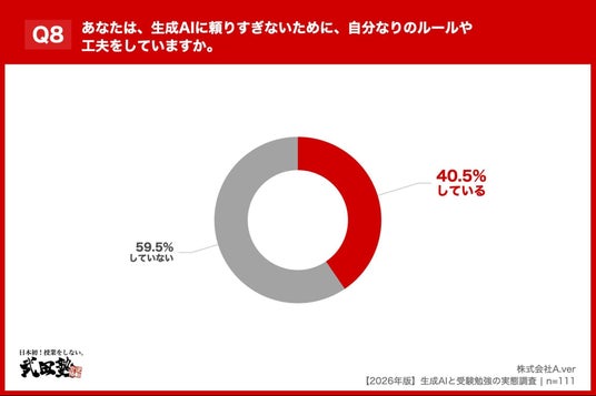 「Q8. あなたは、生成AIに頼りすぎないために、自分なりのルールや工夫をしていますか。」(n=111)と質問したところ、「している」が40.5%、「していない」が59.5%という回答となりました。