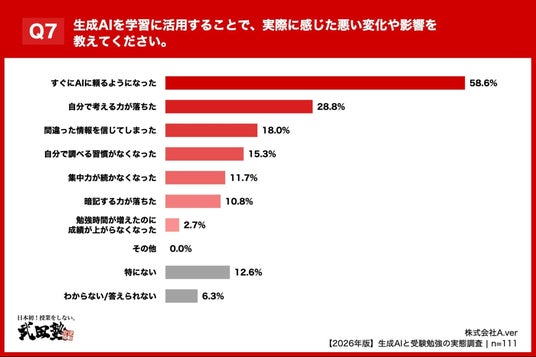 「Q7. 生成AIを学習に活用することで、実際に感じた悪い変化や影響を教えてください。(複数回答)」(n=111)と質問したところ、「すぐにAIに頼るようになった」が58.6%、「自分で考える力が落ちた」が28.8%、「間違った情報を信じてしまった」が18.0%という回答となりました。