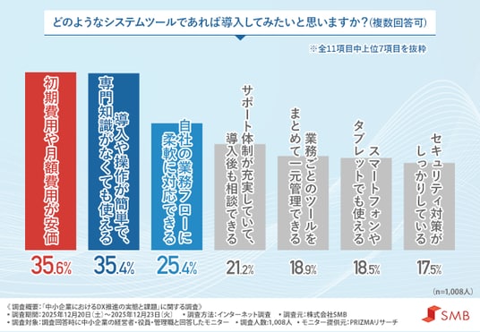 全員に、「どのようなシステムツールであれば導入してみたいと思うか」について尋ねたところ、『初期費用や月額費用が安価(35.6%)』と回答した方が最も多く、『導入や操作が簡単で、専門知識がなくても使える(35.4%)』『自社の業務フローに柔軟に対応できる(25.4%)』と続きました。