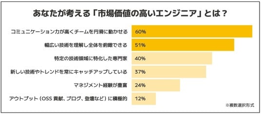 「あなたが考える市場価値の高いエンジニアとは?」(複数回答形式)という設問では、「コミュニケーション力」が最上位要件にあげられており、約6割のエンジニアが賛同。これは従来型のエンジニア像に近い、「特定の技術領域に特化した専門家」を選んだ約4割を大幅に上回っています。
