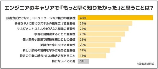 「エンジニアのキャリアで『もっと早く知りたかった』と思うことは?」(複数回答形式)という設問に対しても、コミュニケーション能力の重要性を指摘するエンジニアがもっとも多くなっています。