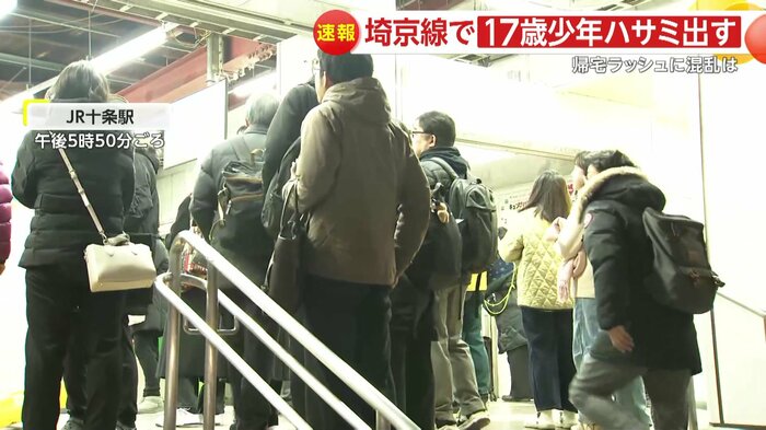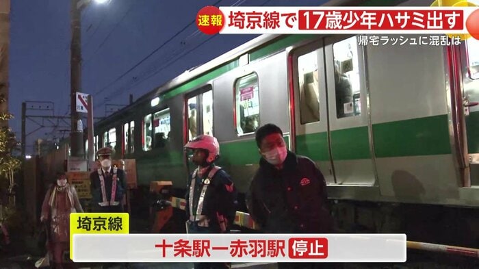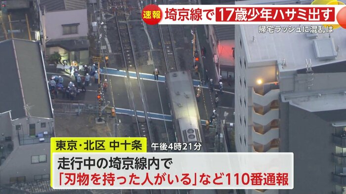午後4時21分、北区中十条を下る、走行中の埼京線の電車内で「刃物を持った人がいる」などと110番通報があり、午後4時36分ごろ、17歳の少年が逮捕された。