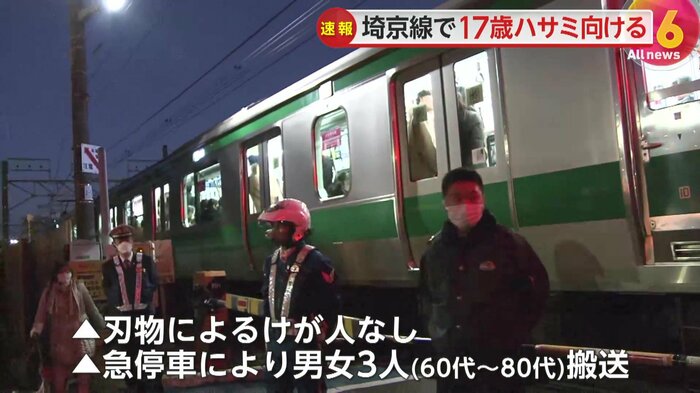 刃物によるけが人はいないということだが、事件が発生した車両が埼京線の十条-赤羽駅間で急停車したことで、60代から80代の男女3人が転倒するなどして病院に搬送された。