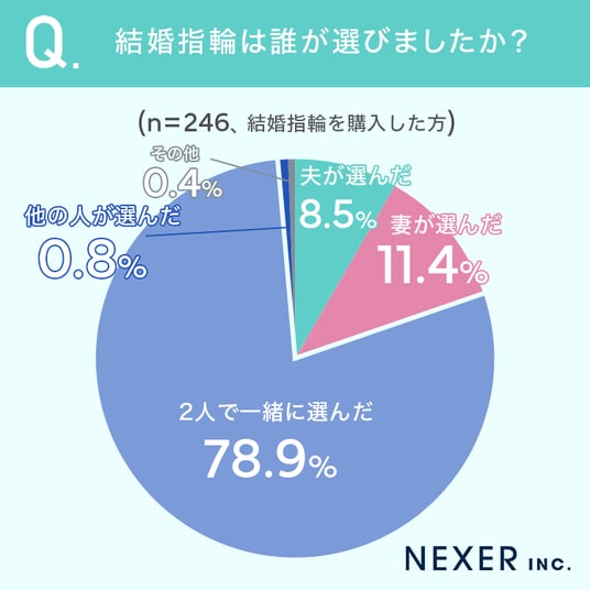 最も多かったのは「2人で一緒に選んだ」で、78.9%と約8割を占めています。次いで「妻が選んだ」が11.4%、「夫が選んだ」が8.5%、「他の人が選んだ」が0.8%、「その他」が0.4%という結果でした。