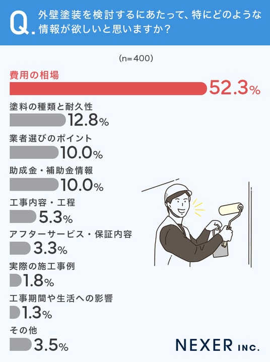 その結果、最も多かったのは「費用の相場」で52.3%と半数を超えました。次いで「塗料の種類と耐久性」が12.8%、「業者選びのポイント」と「助成金・補助金情報」がそれぞれ10%となっています。