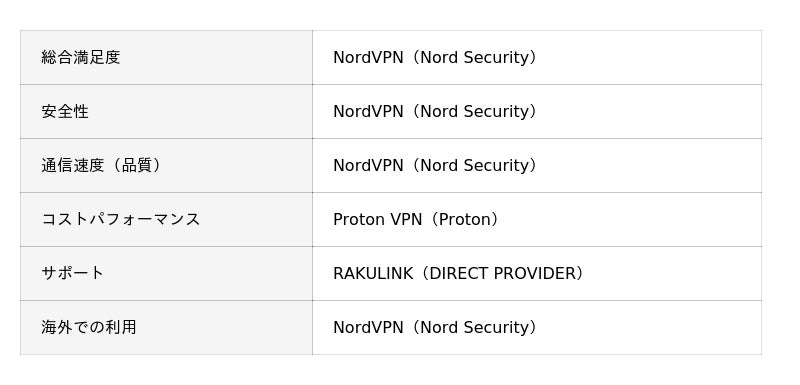 なお、今回はセキュリティーの重要度が叫ばれるなか、VPNサービスにも注目し部門を設けました。ここではNordVPN(Nord Security)が総合満足度で最優秀を獲得。NordVPN(Nord Security)は海外での利用や品質でも高い評価を得ました。