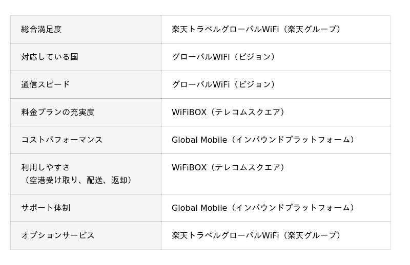 海外Wi-Fiルータレンタル部門では、総合満足度で楽天トラベルグローバルWiFi(楽天グループ)がはじめて1位を獲得しました。