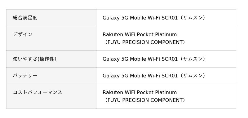 今回の調査結果では、国内のモバイルWi-Fiルータのキャリア部門で「au(KDDI)」「Y!mobile(ソフトバンク)」が最優秀を獲得し、端末部門ではGalaxy 5G Mobile Wi-Fi SCR01(サムスン)が1位となりました。