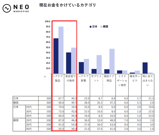 ■日本も韓国も「ヘアケア製品」「美容室での施術」が高い。韓国は全体的にお金をかけており、「サプリメント」「頭皮ケア用品」の需要も高い。