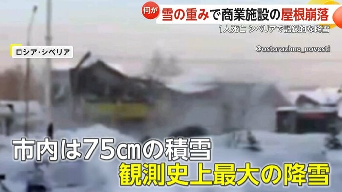 ロシア・シベリアのノボシビルスク市で21日、ショッピングセンターの屋根が記録的な大雪の重みに耐えきれず崩落する事故が発生した。この事故で1人が死亡、2人が負傷した。当時、市内では観測史上最大となる75センチの積雪を記録していたが、事故の原因は積雪だけでなく、建物が安全基準を満たしていなかったことが判明した。