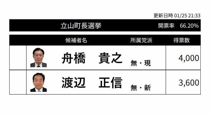 【開票速報】立山町長選挙 開票率66.2%(午後9時半現在) 富山テレビ 2026年1月25日 日曜 午後9:40 25日に投票が行われた立山町長選挙の開票が始まりました。 この記事の画像(2枚) 午後9時半現在の得票です。 開票率66.2% 舟橋貴之(無・現) 4,000 渡辺正信(無・新) 3,600 (富山テレビ放送) 富山テレビ 富山の最新ニュース、身近な話題、災害や事故の速報などを発信します。 1 2 富山テレビの他の記事 【速報】立山町長選挙は現職の舟橋貴之さんが6回目の「当選」【開票結果】 政治 2026年1月25日 【速報】立山町長選挙 舟橋陣営が「勝利宣言」 政治 2026年1月25日 【開票速報】立山町議会議員選挙 開票率24.4% 都道府県 2026年1月25日 【開票速報】立山町長選挙 開票率17.40%(午後9時現在) 政治 2026年1月25日 一覧ページへ