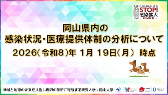 新型コロナウイルス感染症(COVID-19)のパンデミックはWHOから宣言終了が行われ、わが国でも通常の生活が戻りつつありますが、岡山県内の感染・医療体制の状況を把握する点や、みなさまの日常生活における感染予防対策のご参考になればと思い、情報提供を継続しています。よろしくお願い申し上げます。