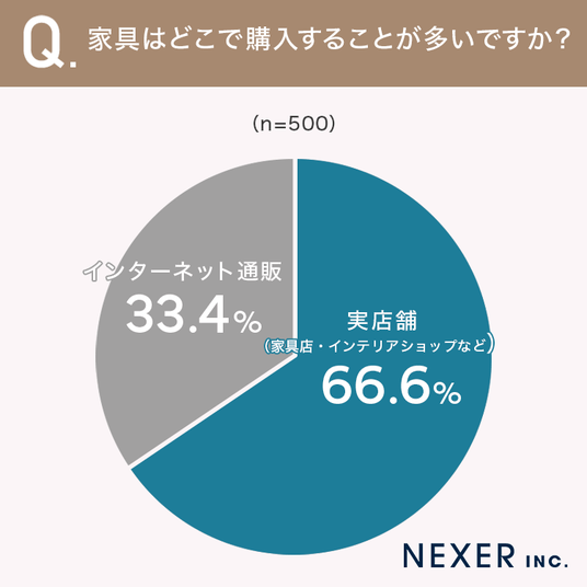 その結果、66.6%が「実店舗(家具店・インテリアショップなど)」、33.4%が「インターネット通販」と回答しました。約3人に1人が、家具の購入にインターネット通販を利用していることがわかります。