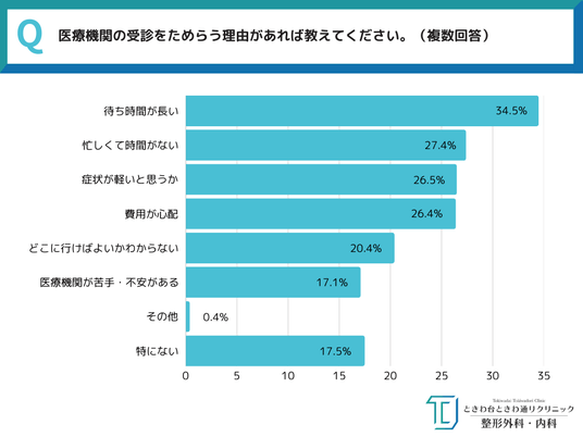 TOP3 1.待ち時間が長い:34.5% 2.忙しくて時間がない:27.4% 3.症状が軽いと思うから:26.5%