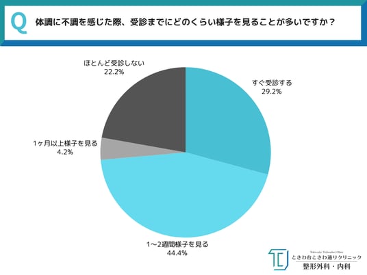 TOP3 1.1~2週間様子を見る:44.4% 2.すぐ受診する:29.2% 3.ほとんど受診しない:22.2%