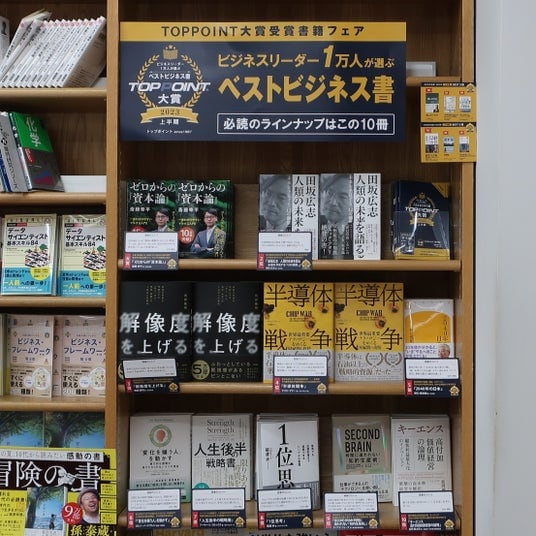 本賞の決定に伴い、丸善ジュンク堂書店、文教堂、有隣堂及び未来屋書店の主要大型店約50店舗にて「TOPPOINT大賞受賞書籍フェア」を開催します。開催期間は、2月1日(日)より1カ月間の予定です。フェアでは、ベスト10冊に選ばれた各書籍を、その書籍の読みどころや読者のコメントを記したPOPと並べて展開。また、大賞を受賞した著者のコメントや本賞の概要を紹介した小冊子(無料)も配布します。