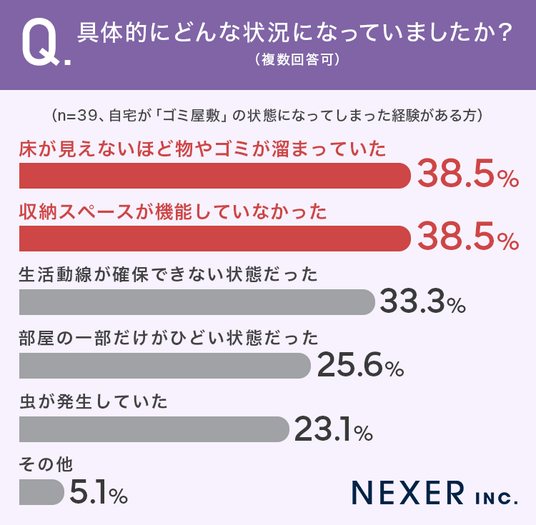 その結果、最も多かったのは「床が見えないほど物やゴミが溜まっていた」と「収納スペースが機能していなかった」で、いずれも38.5%でした。