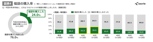 - 24.0%の人が福袋を購入、10~20代の購入率が他年代より高い