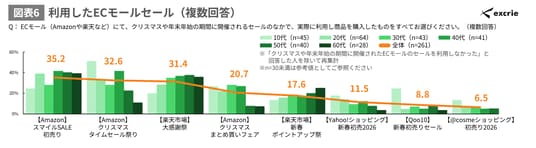 実際に利用したECモールのセールとして、全体ではAmazonが開催した「スマイルSALE 初売り」が35.2%で最も高くなりました。年代によって利用率に違いがあり、楽天市場が開催した「大感謝祭」や「新春ポイントアップ祭」は年代が上がるにつれ、利用率が高くなっています。(図表6)