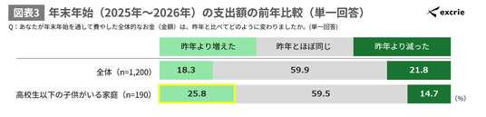 前年(2024年~2025年)と比較した今回の年末年始(2025年~2026年)の支出額を聴取したところ、全体では「昨年とほぼ同じ」が59.9%で最も高く、「昨年より減った」が21.8%、「昨年より増えた」が18.3%でした。高校生以下の子供がいる家庭では、「昨年より増えた」が25.8%で全体を7.5Pt上回りました。(図表3)
