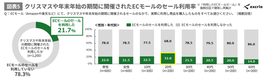 - クリスマスから年末年始開催のECモールセールは21.7%の人が利用、特に20代の利用率が高い