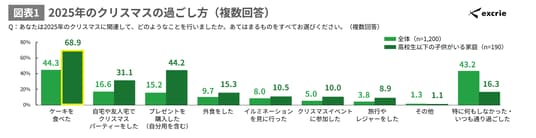 【2025年のクリスマスは「ケーキを食べた」が44.3%で最多、子育て家庭では68.9%】2025年のクリスマスの過ごし方として、全体では「ケーキを食べた」が44.3%と最も多くなりました。特に高校生以下の子供がいる家庭では68.9%と、子育て家庭で高い結果となりました。(図表1)