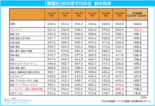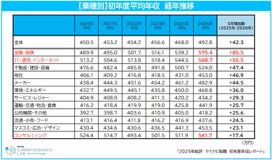 2025年の初年度平均年収は492.8万円で、集計開始以降最高額。5年間で42.3万円増、給与水準は上昇傾向。特に[金融・保険][IT・通信・インターネット][コンサルティング]の初年度年収が高額