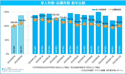 求人件数の2025年平均は前年比137.0%、応募件数の2025年平均は前年比108.8%だった。