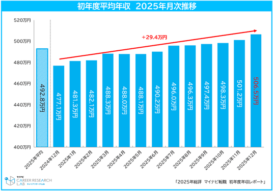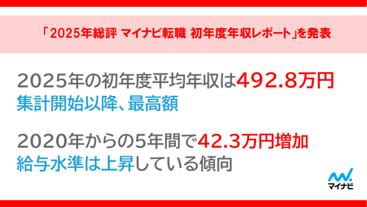 ◆2025年の初年度平均年収は、集計開始して以降最高の492.8万円。5年前の2020年平均と比べて40万円以上増加