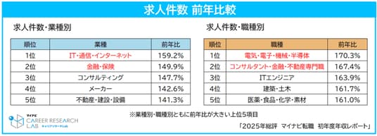 職種別では「電気・電子・機械・半導体」が前年比170.3%、「コンサルタント・金融・不動産専門職」が前年比167.4%、「ITエンジニア」が前年比163.9%で顕著に高く、AI・半導体関連の仕事で採用ニーズが高まっている可能性がうかがえる。
