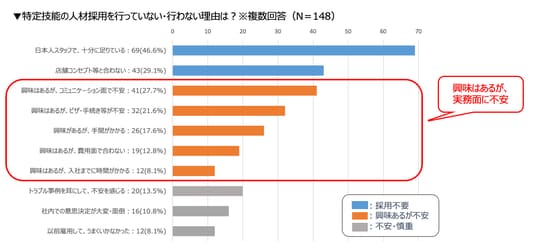 次に、現在、特定技能人材を雇用していない飲食店に対し、採用しない理由を聞いたところ、「日本人スタッフで足りている」(46.6%)、続いて「店舗コンセプト等と合わない」(29.1%)が多く、外国人活用のニーズ自体が無いという回答が多数を占めました。