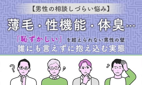 薄毛、性機能、体臭など、男性には他人に打ち明けにくい悩みがあります。これらの悩みは日常生活に影響を与えることがありますが、相談すること自体が心理的なハードルとなり、一人で抱え込んでしまうことが多いのが実情です。