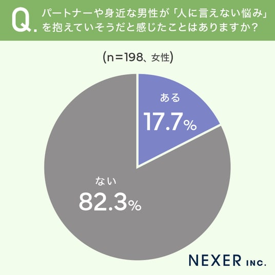 その結果「ある」が17.7%、「ない」が82.3%となり、約2割弱の女性が身近な男性の悩みに気づいたことがあることがわかりました。