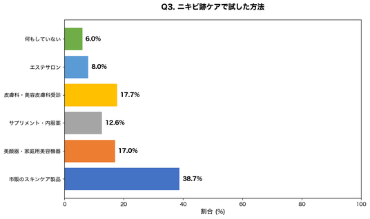 市販のスキンケア製品や美顔器などセルフケアを最優先で試した人が68.3%を占めました。クレーター状のニキビ跡は真皮層の損傷が原因のため、表皮に作用するセルフケアでは根本的な改善が難しいにもかかわらず、多くの方が効果の限られた方法を選択しています。
