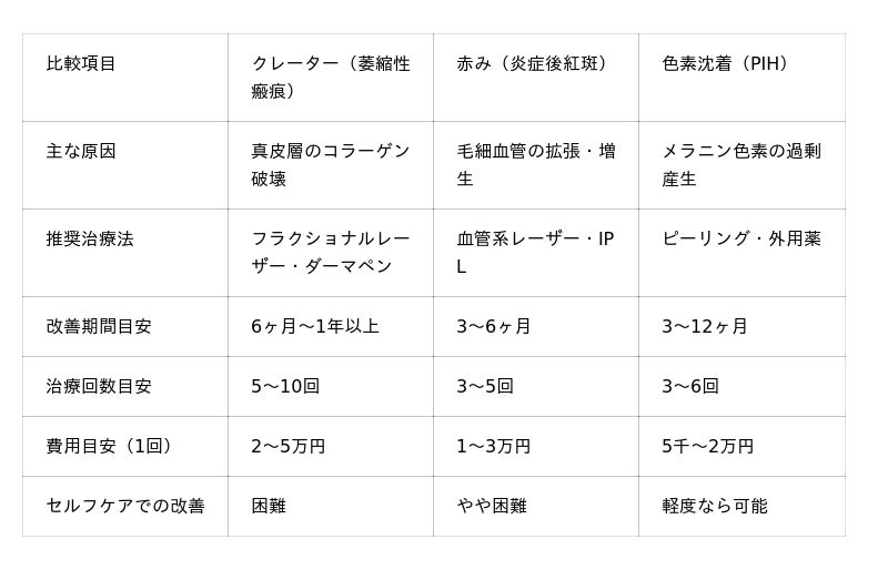 皮膚科医として15年以上の臨床経験から申し上げると、ニキビ跡治療で最も重要なのは、まず自分のニキビ跡が「クレーター」「赤み」「色素沈着」のどのタイプに該当するかを正確に把握することです。タイプによって最適な治療法は全く異なり、誤った方法を続けても改善は期待できません。
