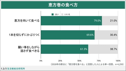 恵方を向いて食べる人が約8割。"食べ方にこだわる"が多数派