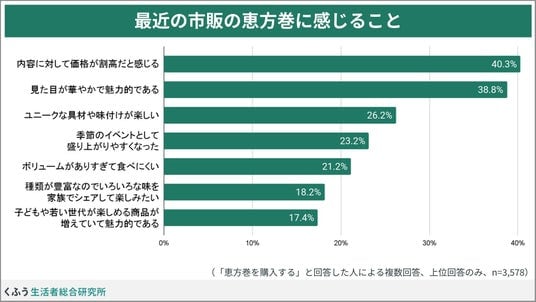 ・市販の恵方巻は「華やかで魅力的」だが「内容に対して価格が割高」と感じる人も