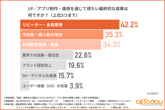 株式会社オールトゥデイ(本社所在地:埼玉県さいたま市)は、美容・健康系の店舗・サービスを運営する企業の1.経営者2.マーケティング担当者かつLP/アプリの制作・リニューアルを検討したことがある方を対象に、「美容・健康系の店舗ビジネスにおけるLP・アプリ制作の課題と成果」に関する実態調査を実施しましたので、その結果を公表します。