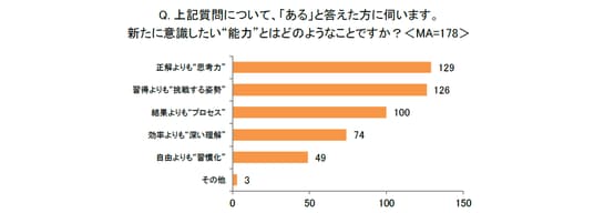 また、「ある」と回答した方に、新たに意識したい“能力”について質問をしたところ、「正解よりも“思考力”」(129)「習得よりも“挑戦する姿勢”」(126)「結果よりも“プロセス”」(100)という回答が上位を占めたことから、知識量や結果そのものより、取り組む過程を重視する親が多いことが読み取れる結果となりました。