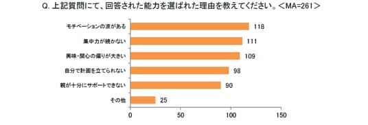 「新年から、子どもに新たに身につけてほしい“能力”は何ですか?<MA>」と尋ねたところ、最も多い回答として「コミュニケーション力」(186)が挙がり、「好奇心/探求心」(163)が続くという結果となりました。また、選んだ理由については、「モチベーションの波がある」(118)が最も多い回答となりましたが、どの回答数も同程度となっていることから、様々な理由から身につけてほしい能力を選んでいることが推測できる結果となりました。その中でも、「コミュニケーション力」や「探求心」は、集中力や、学習への意欲向上にもつながるため、学び全体の質を底上げする基礎となる能力として、選ばれたことが考えられます。