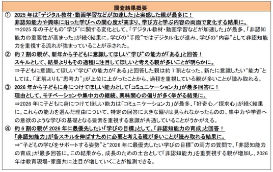 また、先の質問で「コミュニケーション力」「好奇心/探求心」を新たに子どもに身につけてほしいと考える親が多い結果となったことからも、成長する土台として「非認知能力」が必要と考える親が多く、2026年はより教育現場や家庭共にその注目が増していくことが予測されます。