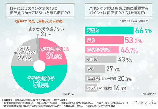 そこで今回、株式会社マナビス化粧品(https://www.manavis-cosme.co.jp/)は、30~50代の女性を対象に、「年齢による肌変化とスキンケア製品選び」に関する調査を実施しました。