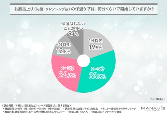 「お風呂上り(洗顔・クレンジング後)の保湿ケアは、何分くらいで開始しているか」について尋ねたところ、『2~3分(33.9%)』が最も多く、『4~5分(24.7%)』と続きました。