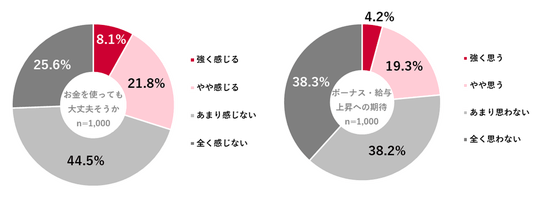 高市政権が掲げる「責任ある積極財政」の考え方のもと、2026年は「お金を使っても大丈夫そう」と感じるかでは、「全く感じない」(25.6%)、「あまり感じない」(44.5%)となった。合わせて約7割が安心感を持てていない様子がうかがえる。また、ボーナス・給与が上がりそうかについて、「全く思わない」(38.3%)、「あまり思わない」(38.2%)が計76.5%と、厳しい見方が大半を占めた。