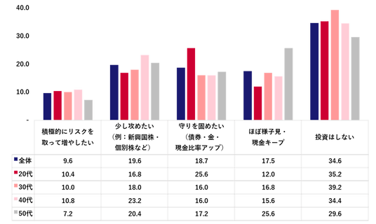 2026年の投資スタンスは、「投資はしない」が全体の34.6%を占めた。「積極的にリスクを取って増やしたい」(9.6%)と「少し攻めたい」(19.6%)を合わせた積極派は29.2%、「守りを固めたい」(18.7%)と「ほぼ様子見・現金キープ」(17.5%)を合わせた慎重派は36.2%だった。積極派の割合が高かったのは40代で34.0%となった。