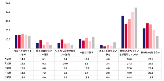 また新NISAについては、「知らない」が22.1%、「知っているが使っていない」が全体の36.0%だった。制度を認知していない人や、認知しつつも未利用の人が半数以上、存在している。